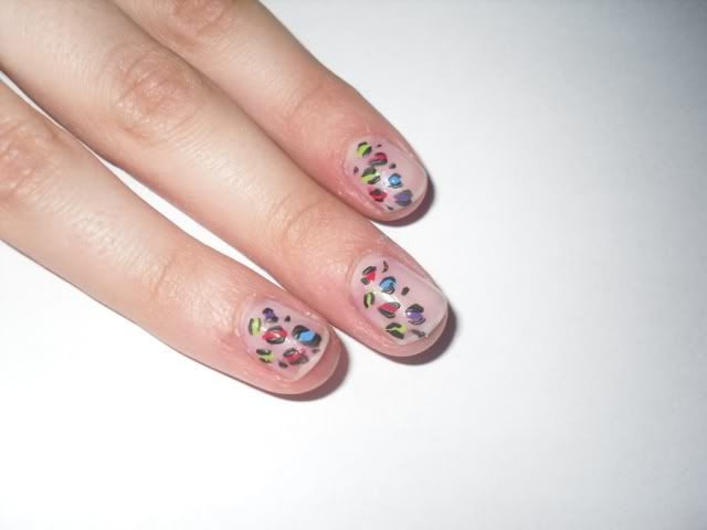 ![]() Będziesz potrzebować: ![]() * kolorowe lakiery ( u mnie Joko oraz Silcare) * bazę oraz utwardzacz * neutralny lakier podkładowy * czarną farbę akrylową (u mnie Polycolor) * cienki pędzelek do zdobień ( u mnie Kozłowski, kuna, 3/0) 1. Standardowo przygotowujemy płytkę. Nakładamy bazę oraz lakier podkładowy w delikatnym kolorze. ![]() 2. Przy użyciu kolorowych lakierów oraz pędzelka malujemy nierównomierne plamki. ![]() 3. Za pomocą czarnej farbki oraz pędzelka obrysowujemy cętki, malując 2-3 nieregularne kreski wokół cętki. Pomiędzy cętkami dorysowujemy delikatne pojedyncze kreseczki. Należy pamiętać, aby kreski nie były zbyt grube ![]() ![]() 4. Po wyschnięciu farbki oraz lakierów, nakładamy nabłyszczacz. Na dłonie nakładamy krem, a skórki nawilżamy oliwką. I gotowe ![]()