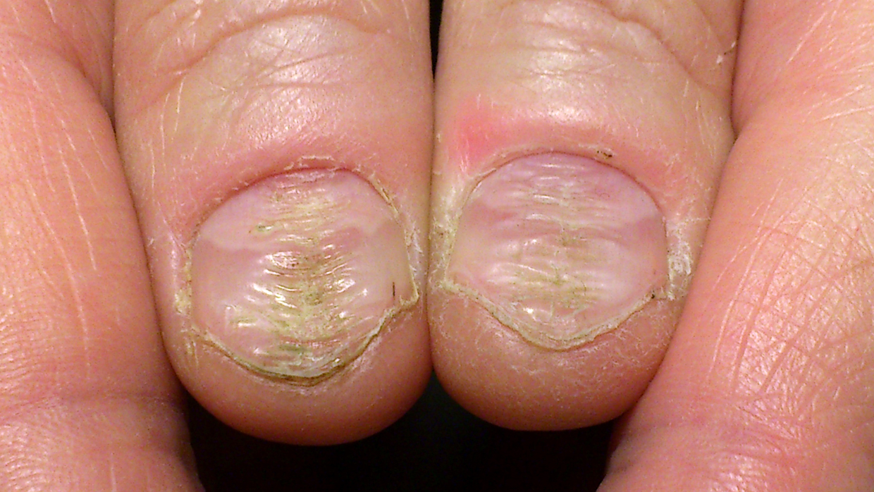 Informacja z forum medycznego: "W pierwszej fazie choroby płytka paznokciowa zaczyna matowieć a następnie zmienia swoją barwę. Paznokcie stają się białe, zielnikowe lub brązowe i pojawiają się na nich specyficzne bruzdy. Nagromadzone pod paznokciami złogi grzybów wydzielają nieprzyjemny i dość specyficzny zapach, którego nie można zniwelować nawet wyjątkowo dokładną oraz codzienną higieną. Nieleczona grzybica co pokazują zdjęcia, doprowadza do łamliwości oraz kruchości płytki paznokciowej, która zaczyna się rozwarstwiać." Zdjęcie z tego portalu w załączniku jest bardzo podobne do wklejonego przez Ciebie.