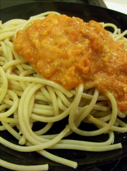 A przepis jest, cóż. Sparzyć jednego (1) pomidora, pokroić w kosteczkę, smażyć go na patelni z czosnkiem, podlewając trochę wodą aż się zrobi papka. Dodać soli, chili, papryki, pokrojonego sera (ja dodałam ok. 25g mozzarelli, tak 1/5 kulki), mieszać aż ser się rozpuści, nałożyć na makaron. Tadaa! |