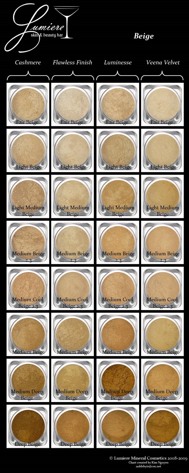 http://4.bp.blogspot.com/_QlVIlkjqjP...beigechart.jpg Druga kolumna, formuła Flawless Face. Miałaś Light Medium Beige, Medium Beige 2.3, Medium Cool Beige 2.3. Jeśli im wszystkim dolegało to, że były za jasne, to następny w kolejności jest Medium Beige. Jeśli i on Ci nie podpasuje, być może to oznacza, że grupa beżów nie jest Twoją grupą? |