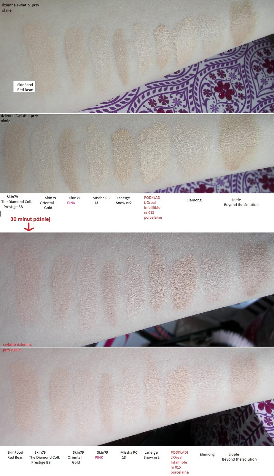 Skin79 PINK Elemong Missha Perfect Cover numer 13 Laneige Snow Lioele Beyond The Solution Skin 79 Oriental Gold Skin79 the prestige Skin Food Red Bean (nie wiem, czy tu są 2 odcienie - na samplu są maczki, jedyne, co jest po naszemu, to samotna cyferka '2' - może to nr odcienia?] DOPISEK: TUTAJ większe zdjęcie DOPISEK2: dodałam jeszcze jedno zdjęcie 30 min. po aplikacji